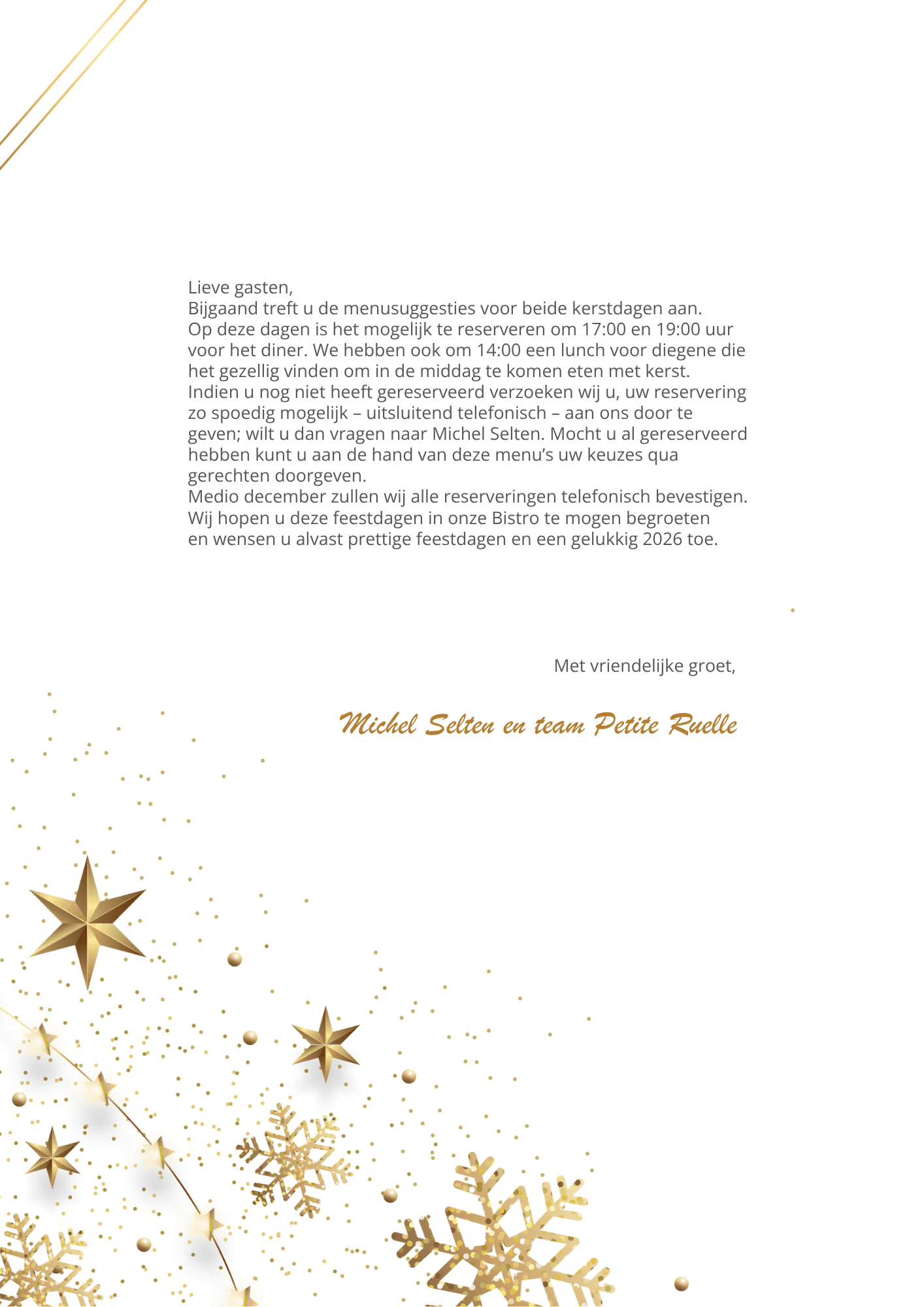 Bekijk ons kerstmenu hierboven en geef je menukeuze door bij je reservering. Nog niet gereserveerd? Dat kan uitsluitend telefonisch, vraag naar Michel Selten.